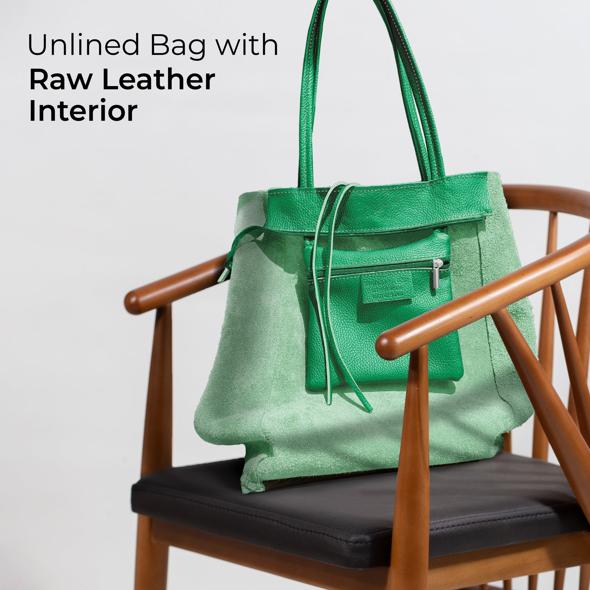 Inside, the suede-like reverse side of the leather serves as the lining, while the spacious main compartment holds all your daily gadgets and documents. A single neat zippered pocket keeps small items secure, preserving the clean aesthetic of the interior.